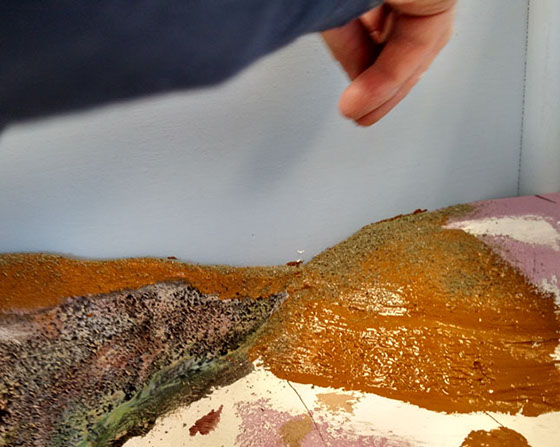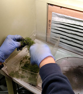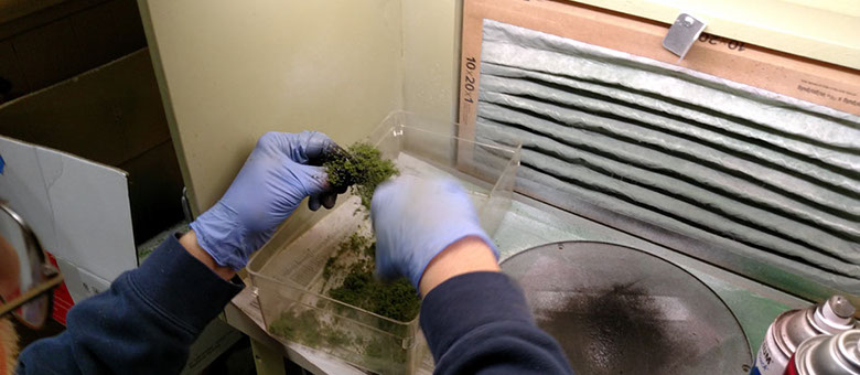 Making the shrubbery and bushes. Mike takes a piece of furnace filter and stretches it out.