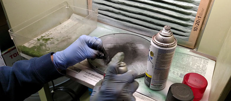 He then sprays Hair Spray, of all things, to get a sticky surface.