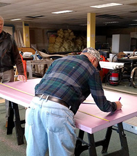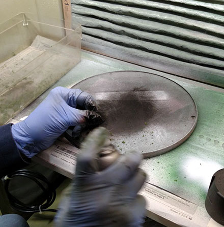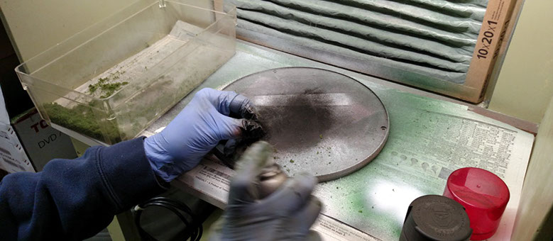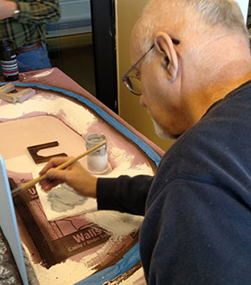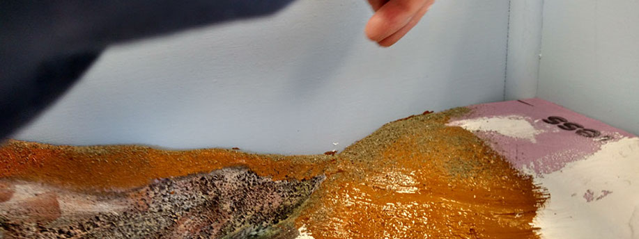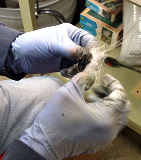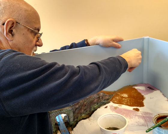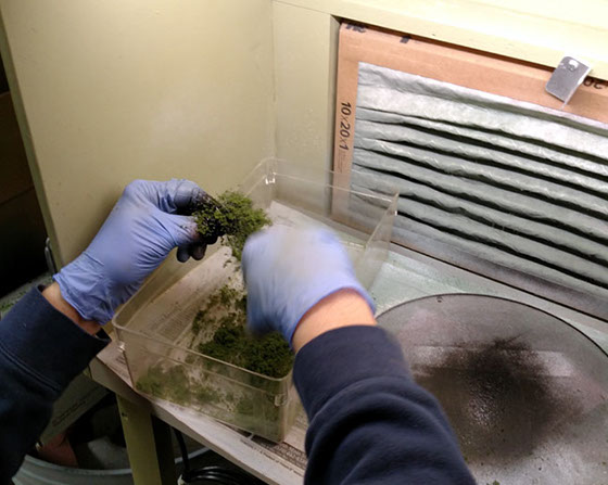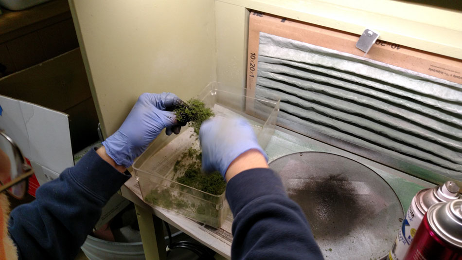Making the shrubbery and bushes. Mike takes a piece of furnace filter and stretches it out.
