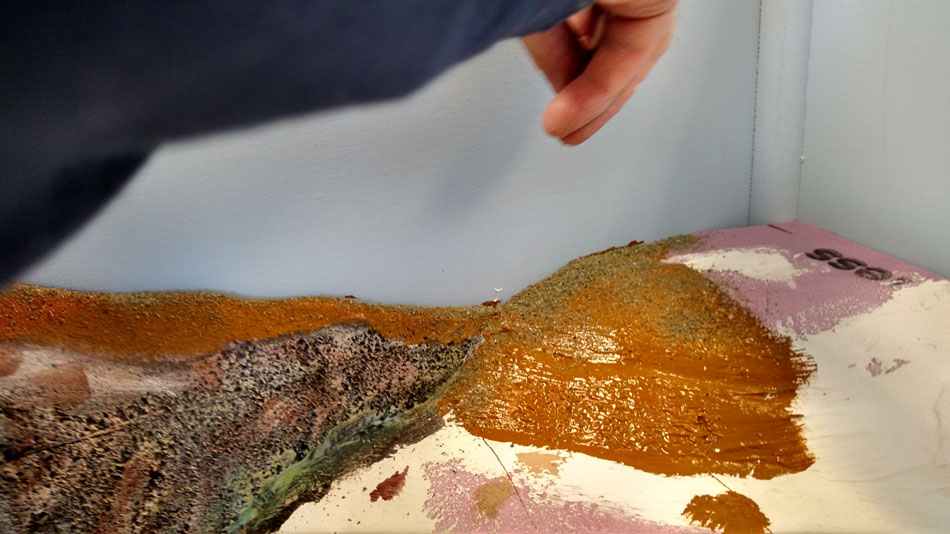 He then sprays Hair Spray, of all things, to get a sticky surface.