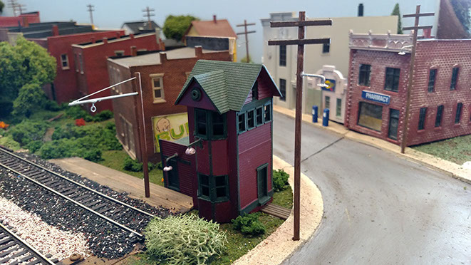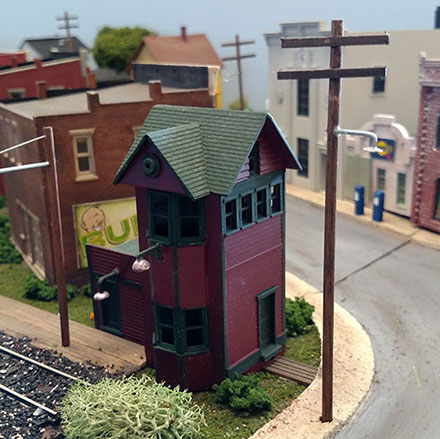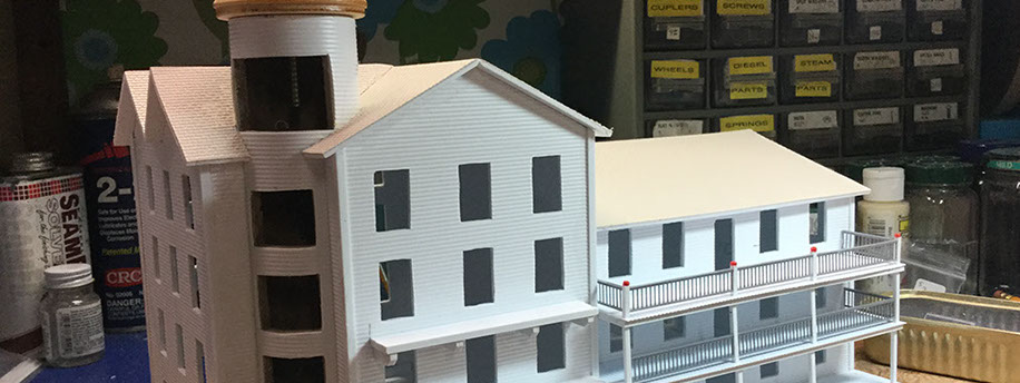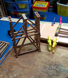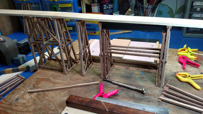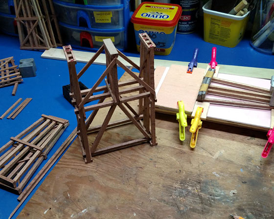 Mike made a jig (background) that allows the gluing of the various sized towers needed to support the tracks.